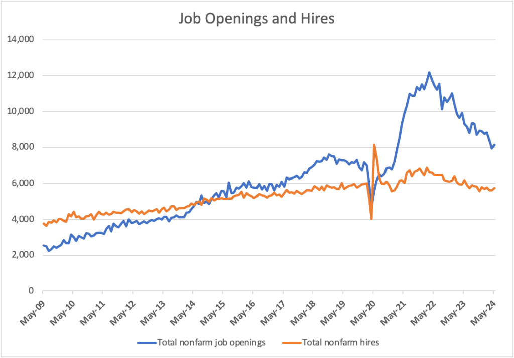 During the periods of ZIRP (Zero Interest Rate Policy) between 2008 and 2015 and 2020-2022, job openings ticked up greatly (as seen in the BLS data below). ZIRP incentivized companies to hire more folks as a result of lower borrowing/opportunity costs. These job openings especially boomed in 2020-2022 during COVID as company revenue grew through increased spending from stimulus checks and increased personal savings which resulted in job growth.