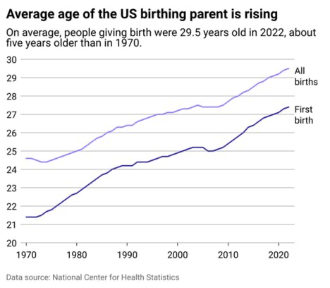 Family care: As millennials increasingly become the next big “sandwich generation,” many of us are having to step back (temporarily or permanently) from our jobs in order to take care of our parents as they age. As we wait longer to have children (likely due to skyrocketing tuition and housing costs, among other things), we are in the position of having young kids while our parents are older. With the average age of birthing continuing to increase, it’s possible we’ll be placing this burden on our future children as well (unless Tesla Optimus robots come to save the day which I’m bullish on 😁).